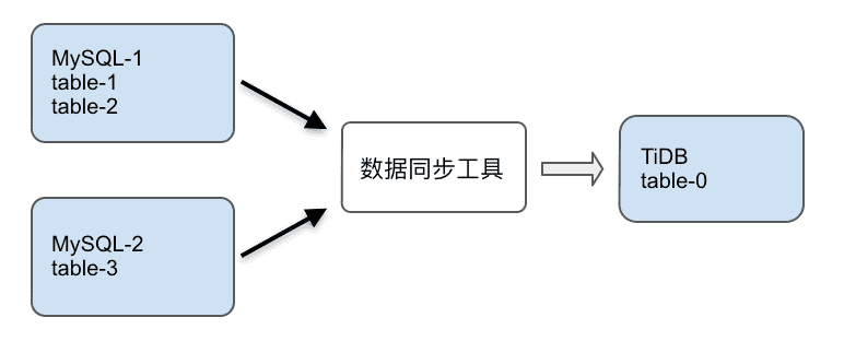 假设有两个 MySQL 实例,使用同步工具同步到一个 TiDB 中,场景如图所示: